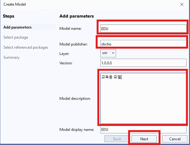 Extensions > Dynamics365 > Model Management > Create Model 을 선택한다.