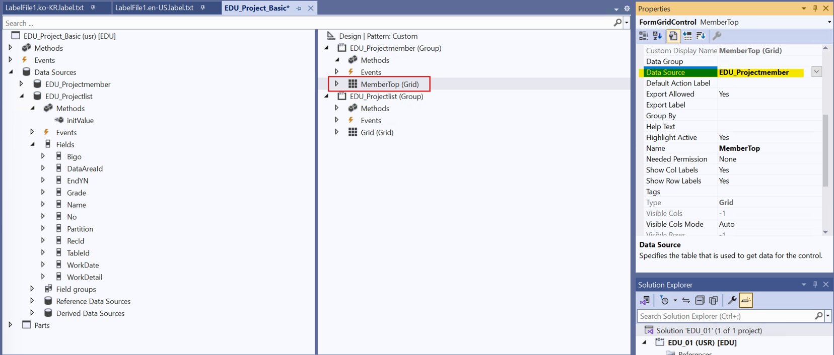 폼의 Grid 클릭 > Properties > Data Source 연결