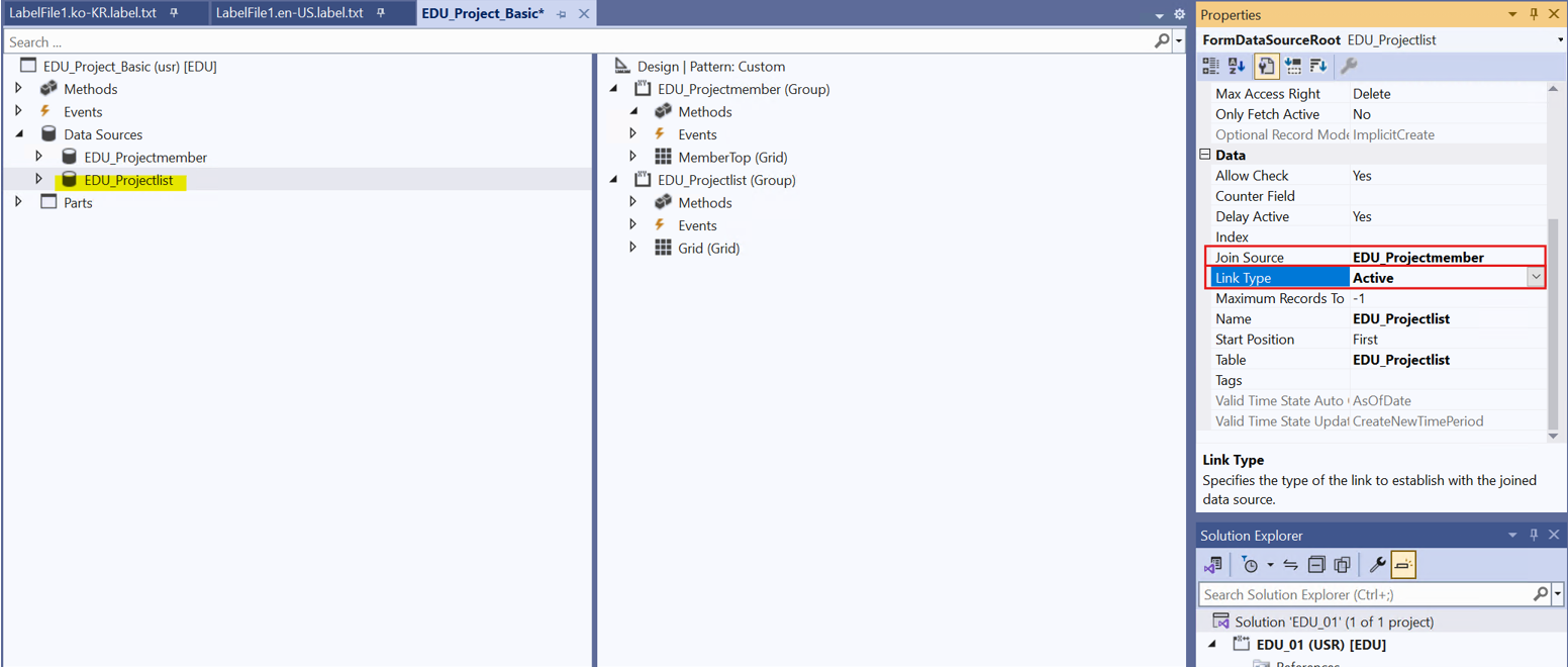 자식 Table ‘EDU_Projectlist’에 부모 Table(EDU_Projectmember) Join Source를 연결하고, Link Type을 'Active'로 설정한다.